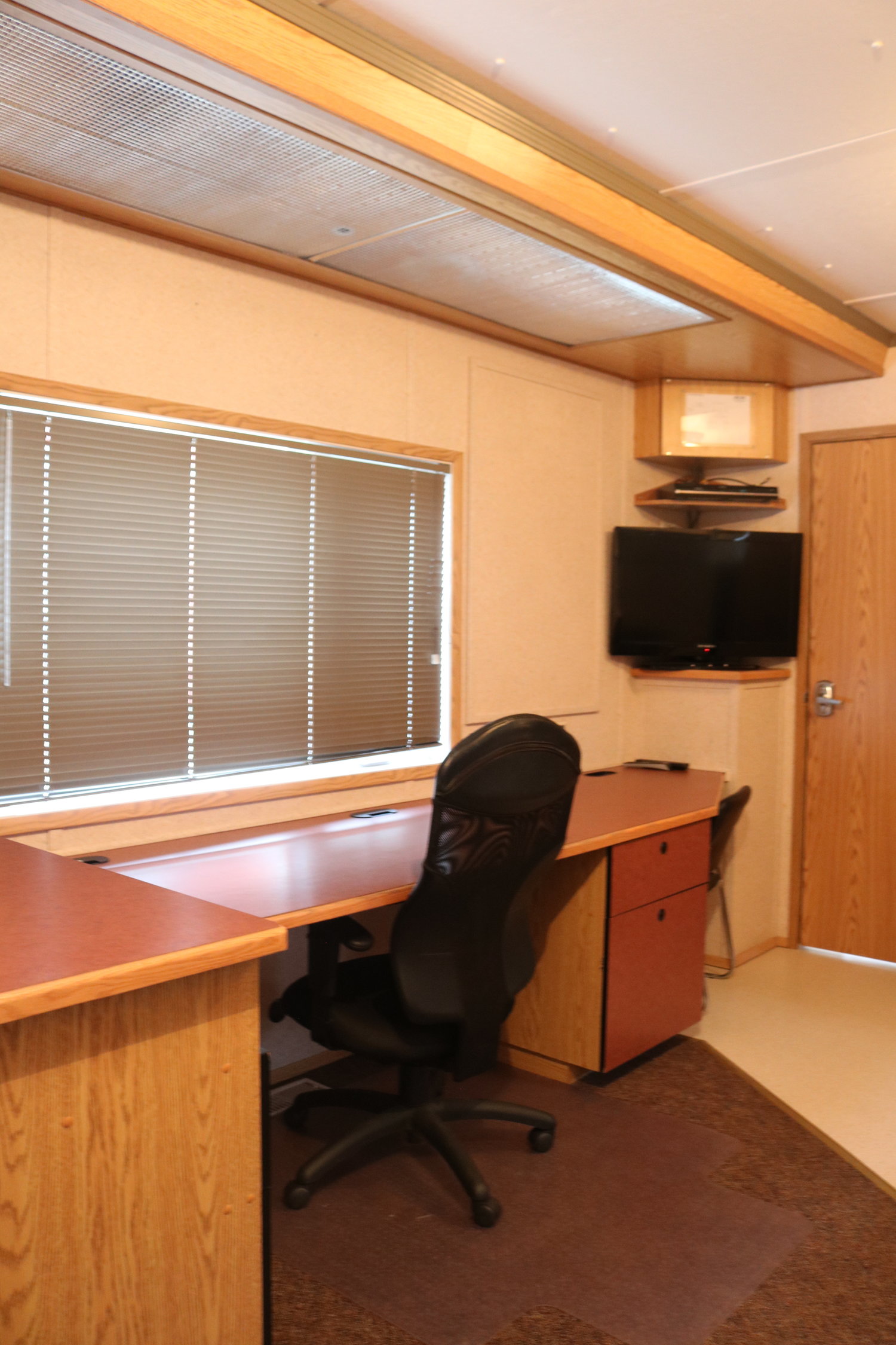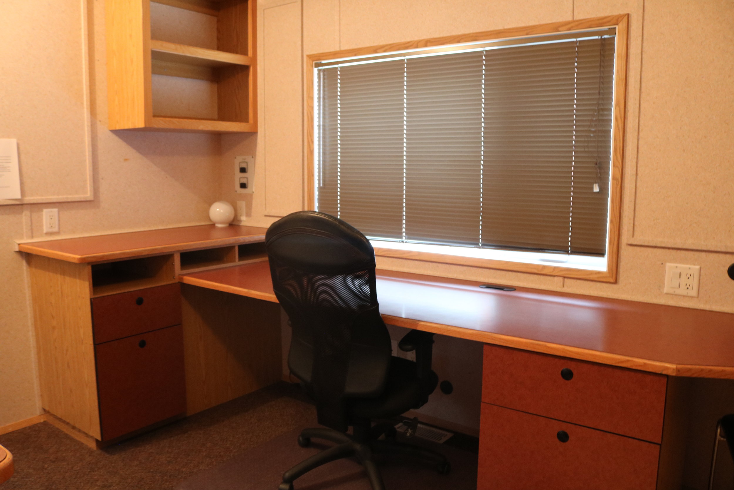 The living room is furnished with a sofa, television, long worktable with enough plug ins for computers and other electronics, stereo, dvd player.